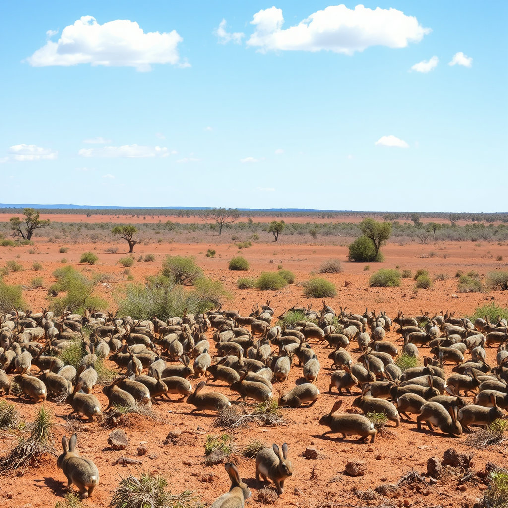 영국인들이 사냥용 목적으로 유럽산 토끼를 도입하였으나, 천적이 거의 없는 호주의 환경에서 토끼가 폭발적으로 번식했습니다. 이 과정에서 토끼가 초목과 토양을 과도하게 파괴했습니다. - 결과:
